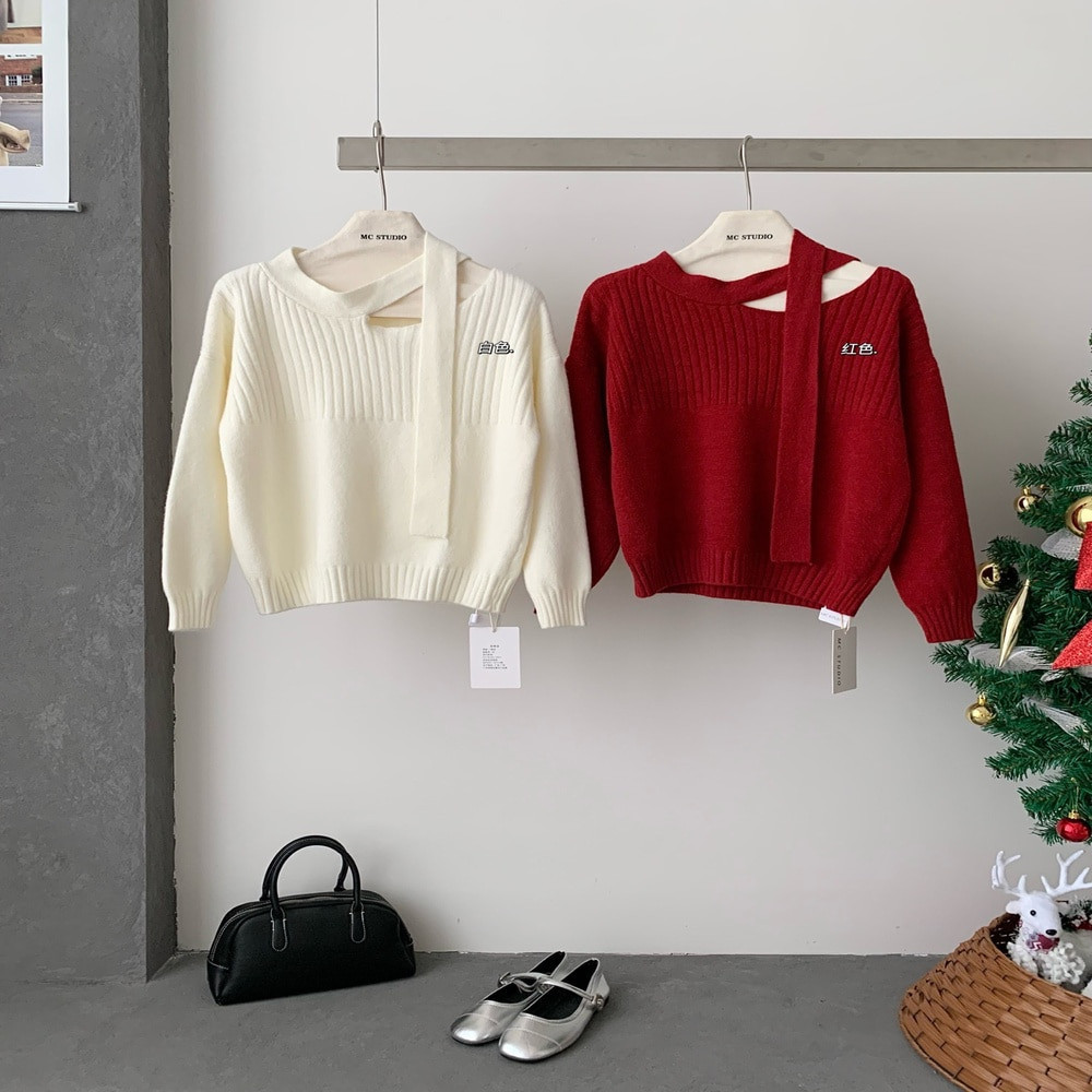 • 제품명: 오프숄더 고정 리본끈 니트