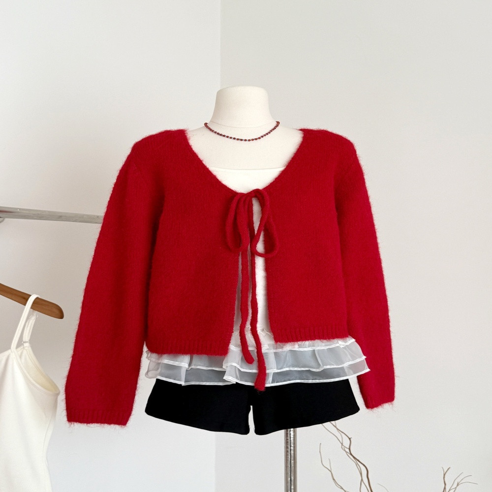 • 제품명: 레드 리본 스트랩 가디건 더블 프릴 탑 세트