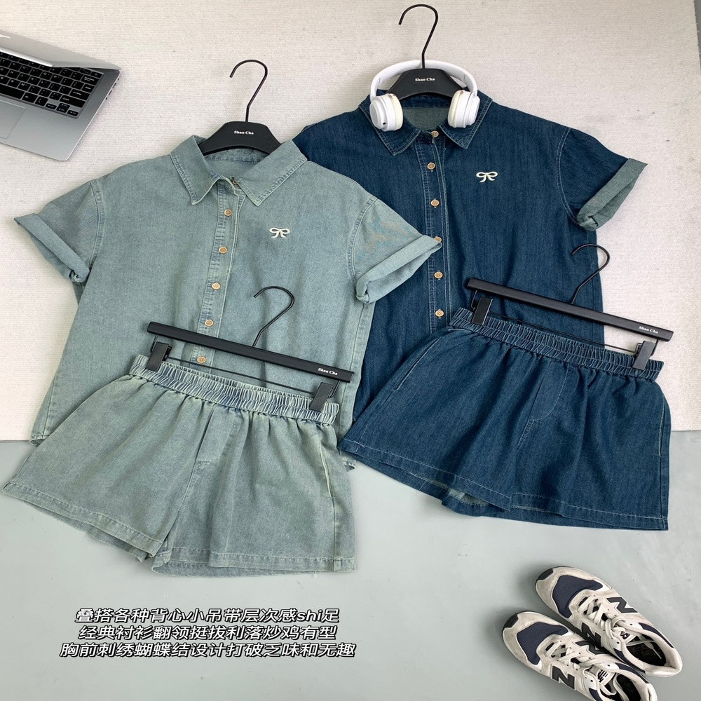 • 제품명: 자수 리본 카라 데님 셔츠와 밴딩 와이드 숏팬츠 세트